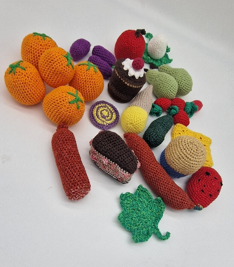 • Inhalt: 2x Blatt, 1x Ei, 1x Apfel, 2x Birnen, 3x Pflaumen, 4x Erdbeeren, 5x Orangen, 1x Lolli, 1x Wassermelone, 1x Wurst, 1x Früchtebrot, 1x Schokokuchen, 1x Muffin, 1x Eis, 1x Gurke, 1x Scheibe Käse, 1x Salami